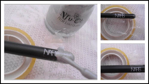 Como vocês podem ver na foto que estou passando o esmalte delimitei a parte que queria pintar que foi a pontinha do cabo, já na segunda foto do lado direito delimitei duas partes do pincel, pois queria pintar entre o meio das fitas adesivas.