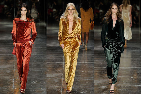 O veludo promete ser o tecido do inverno de 2012! Com a sua textura macia e gostosa, aliada a cores fortes como o vermelho, ele promete ser uma ótima opção para aquelas mulheres que gostam da vida noturna. Pudemos perceber nos desfiles das grifes Animale, Osklen (com uma proposta mais jovial), Ellus, Reinaldo Lourenço e várias outras que este tecido vai dar o que falar! Destaque também para o efeito molhado no veludo, dando um ar mais sexy a produção.